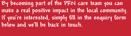 PRN Nursing and Care Services is a well known and growing employer, where first class opportunities await. Experience is not necessary as full training will be given. All we ask is that you're a people person, friendly and reliable.
